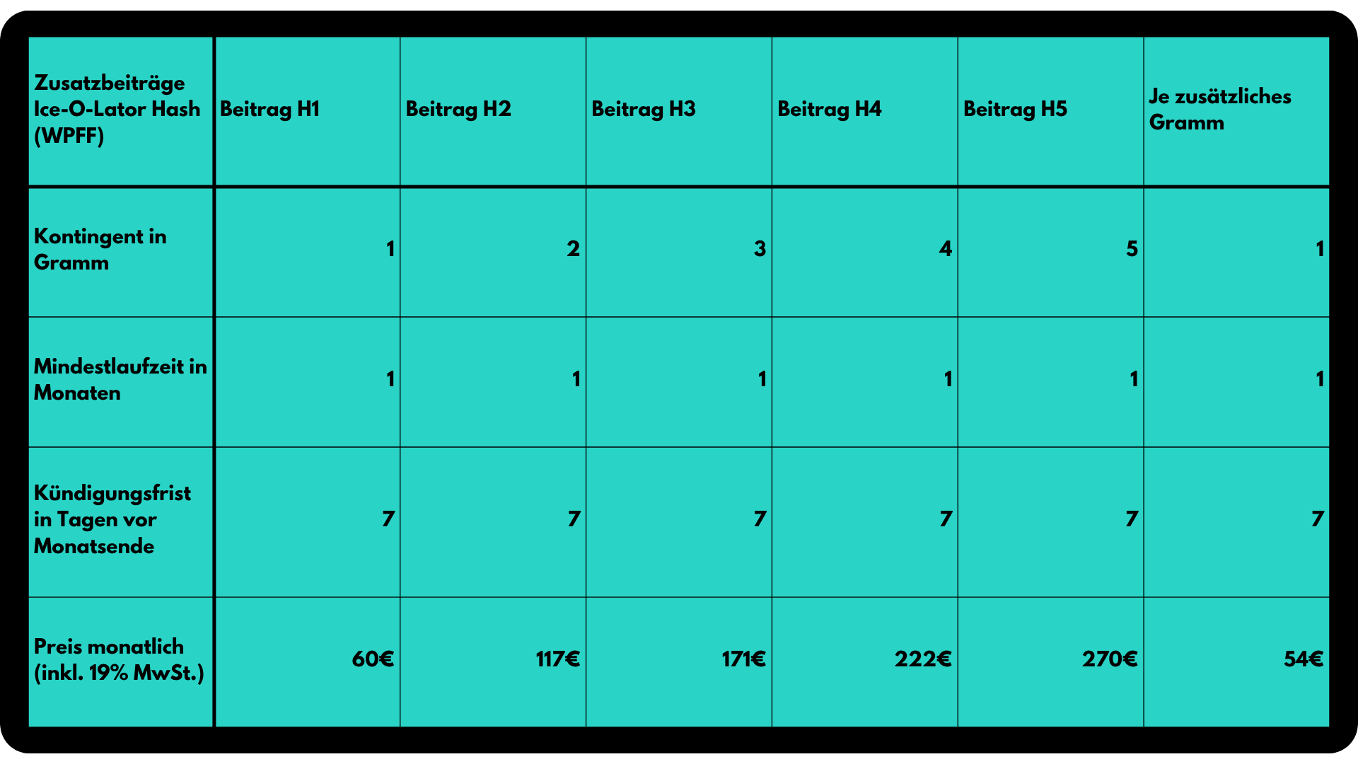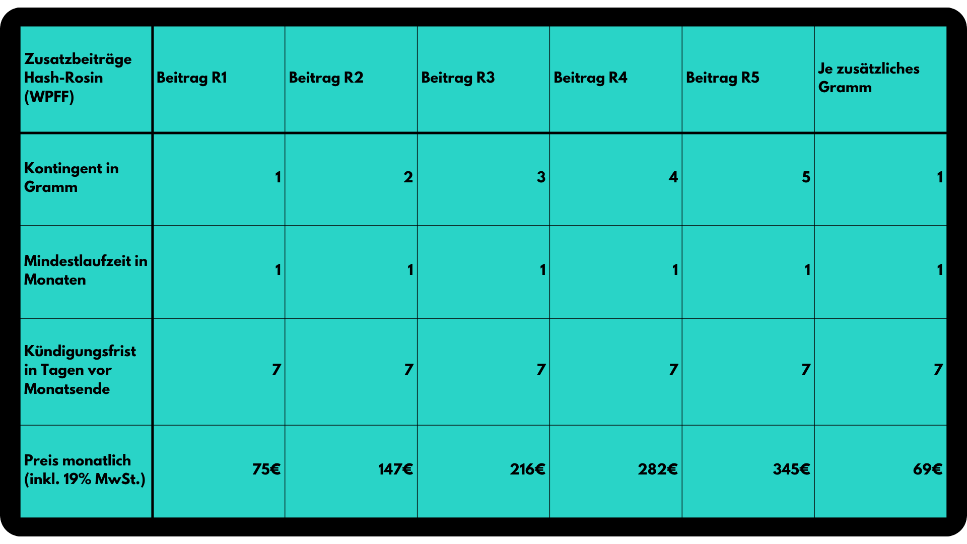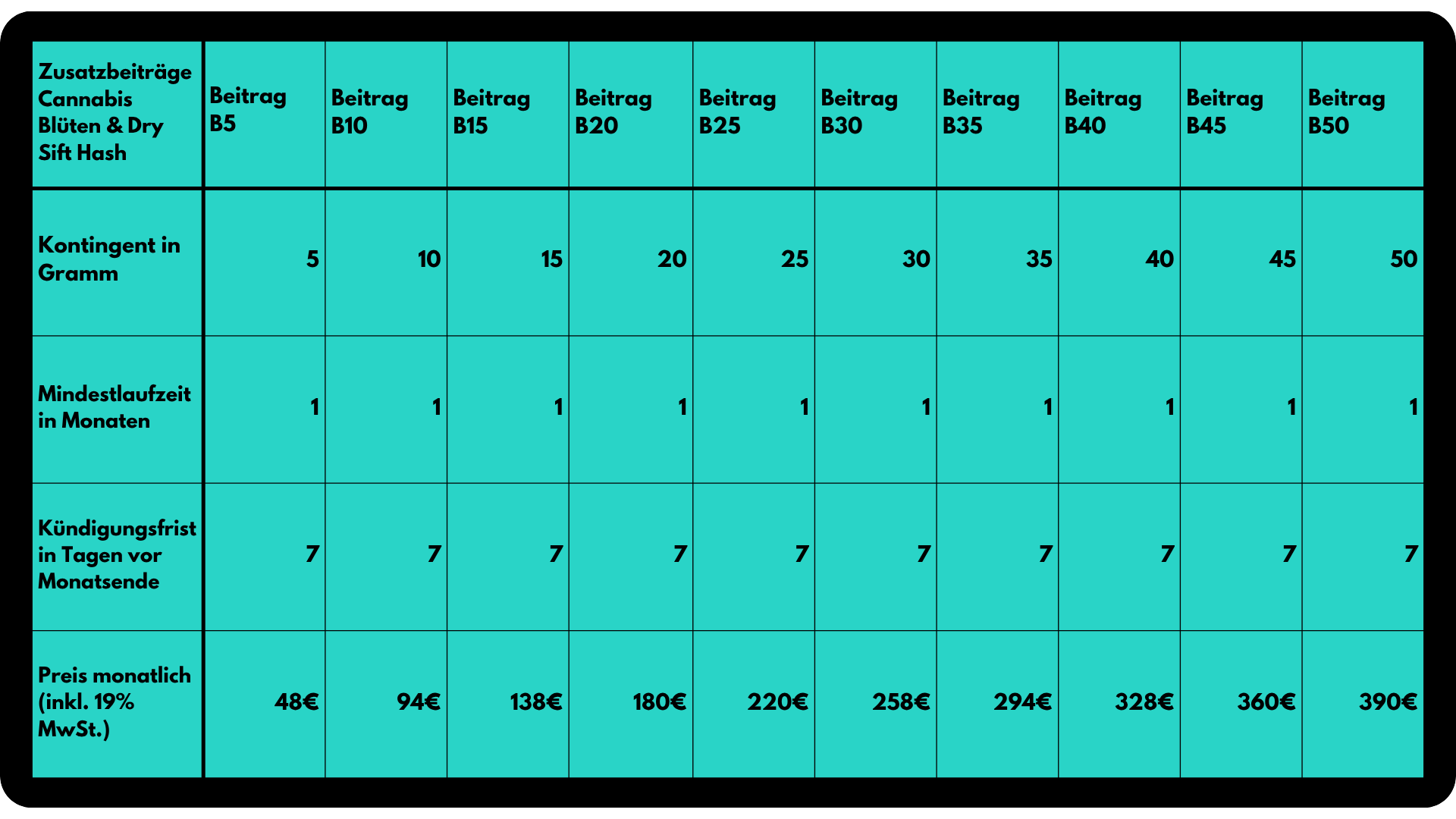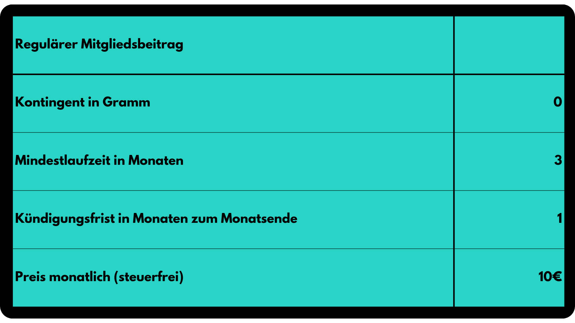 Der monatliche Mitgliedsbeitrag setzt sich aus dem regulären Mitgliedsbeitrag (10€) & den gewählten Zusatzbeiträgen zusammen. Der reguläre Mitgliedsbeitrag beinhaltet dabei kein Cannabis. Zum regulären Mitgliedsbeitrag können Zusatzbeiträge, die Cannabis beinhalten, dazu gebucht werden. Dabei bestimmen die Zusatzbeiträge, welche Cannabisprodukte und wie viel Gramm man pro Monat erhält. Die Zusatzbeiträge sind kombinierbar und können monatlich bis 7 Tage vor Monatsende geändert werden.